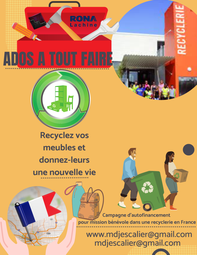 Le but « d’Ados à tout faire », qui est encadré par des animateurs de la MdJ l’Escalier en collaboration avec des entrepreneurs du bâtiment Lachinois et alentours ainsi que « d’Hommes à tout faire » se conclura par une mission bénévole de 5 jours en France à la découverte d’un réseau de recyclerie parisienne. Pendant une semaine ils pourront mettre à profit leurs compétences acquises durant ses ateliers. Cette expérience deviendra significative dans leur parcours de vie personnelle et professionnelle.