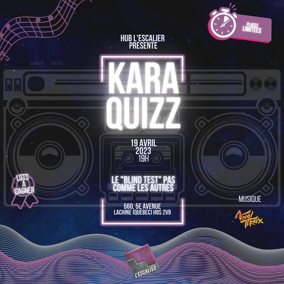 Le KARAQUIZZ, revient! 18 avril 2023mdjescalier Laisser un commentaire Notre DJ préféré est de passage à la MdJ après l’atelier culinaire pour sonner le retour du printemps! On va avoir du fun !